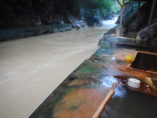 27日の夕方5時30分頃の川岸露天風呂です。午後 かなり強めの雨が降り 水は濁っていますが 冠水は免れています。 [全文を表示]